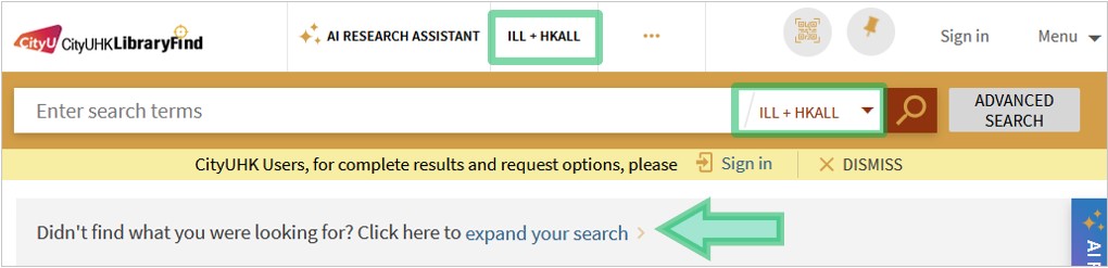 Users have the option to use Interlibrary Loan Services (ILL+HKALL) to search for and request both physical and digital materials from other UGC-funded libraries in Hong Kong, as well as institutions globally. If you can't locate the desired item, you can click on "Expand your search" on the Results page to submit a request.